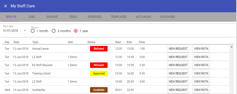 The Service page displays a list of all activity, shift & leaves, for the currently logged on staff member.