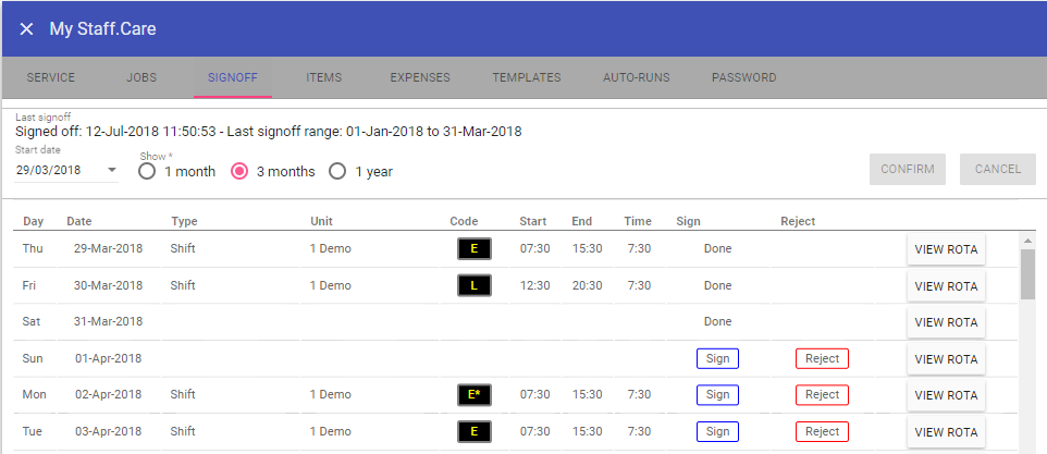 The Signoff Tab allows staff members to electronically signoff their Timesheets to say that they agree with the Rota that has been worked or disagree (Reject) the Rota that has been worked.