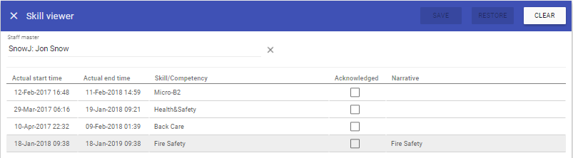 Acknowledge Skills is possible via this screen.