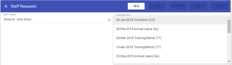 Leave Request: A drop down menu detailing all previously created requests.