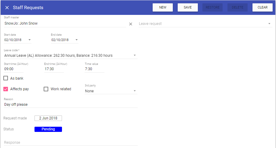 Staff master: Displays the staff member that the Request pertains to.
