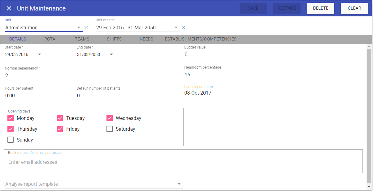 Start date: Enter a date when the unit master will start. This will need to be the same as the date of the first schedule required. Ensure that the date chosen reflects the normal starting day for a rota, if the unit schedules from a Monday ensure the date entered is a Monday.