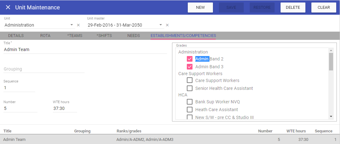 Grades: By checking the tick box, select the Ranks and Grades that make up the selected Establishment requirement.