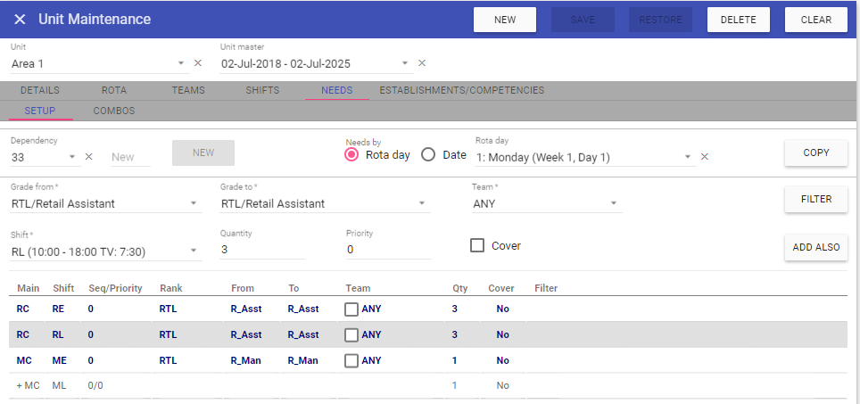 Copy: Allows for previously created needs, for other rota days, to be copied and used against another rota day.