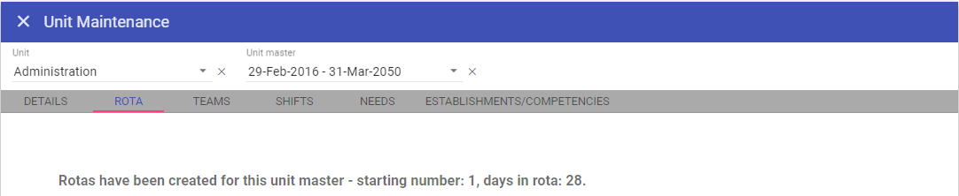 Once a rota for the unit has been created successfully this cannot be changed and will show the following.