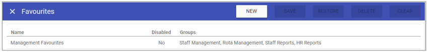 Favourites is used to define the library of favourites used for quick access to Staff.Care Menus from the initial page when first logged in. An example looks like the following: