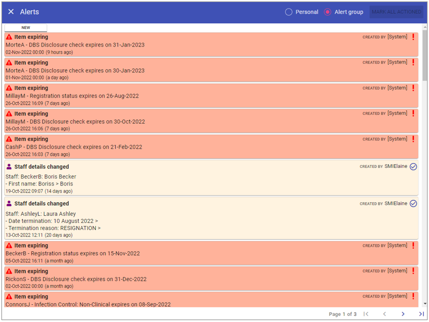 MARK ALL ACTIONED - Only available in the personal Alerts section.