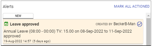 Once saved this will automatically mark any Alerts containing these leave requests as actioned and the staff member will receive an Alert stating their leave has been updated: