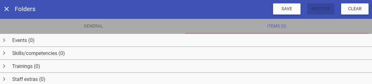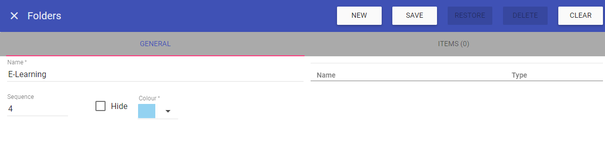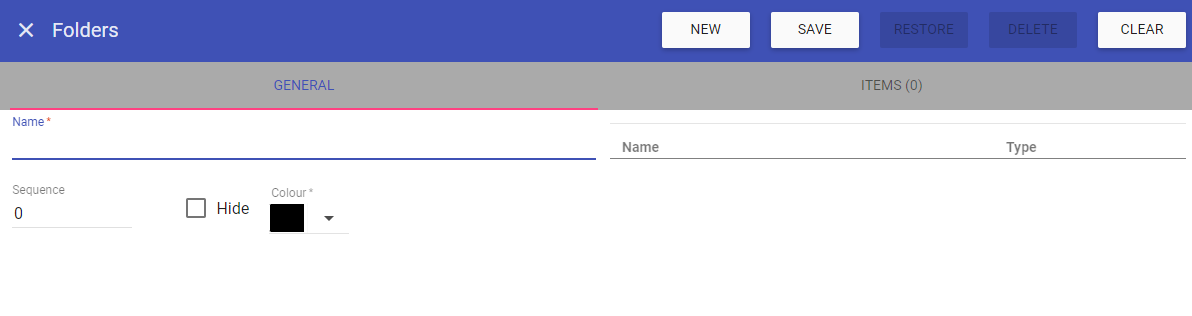 With the folder saved and selected, you can now add the required items to this folder by clicking on the ITEMS tab: