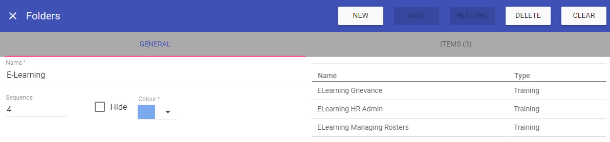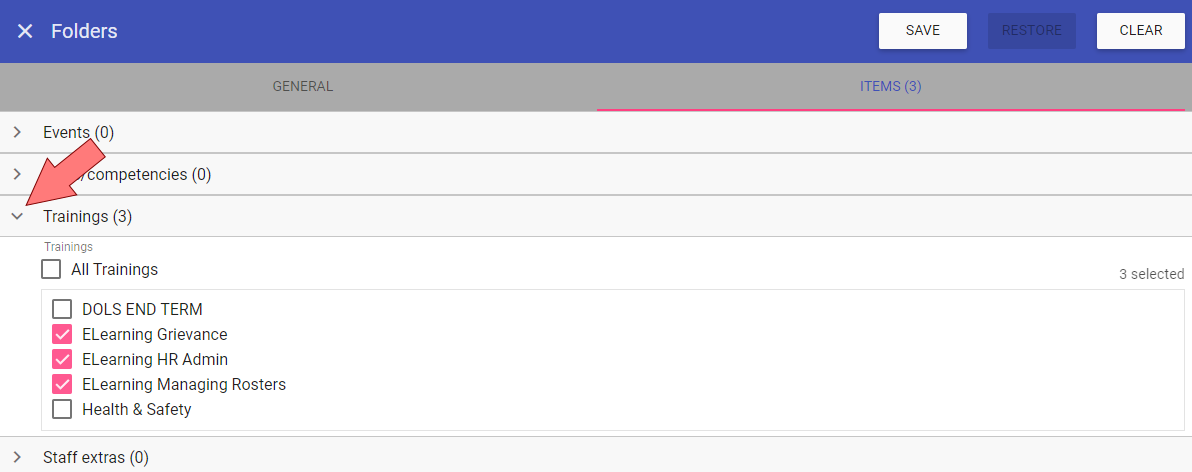 NOTE: Once you have your folders built, when you add a new item, they can be assigned to folders directly from Admin > Events/Skills/Staff Extras/Trainings