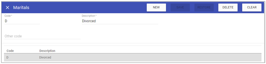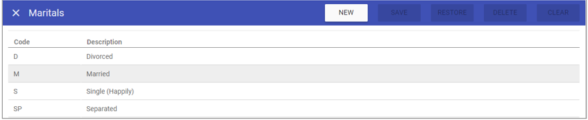 1. To add or edit details of a marital that has already been created, select the marital by double clicking on the required marital.