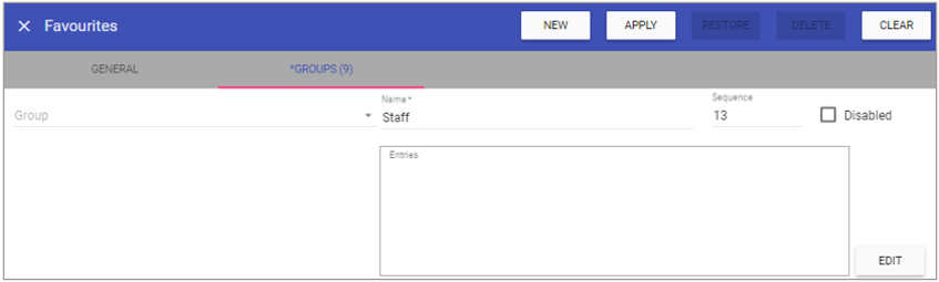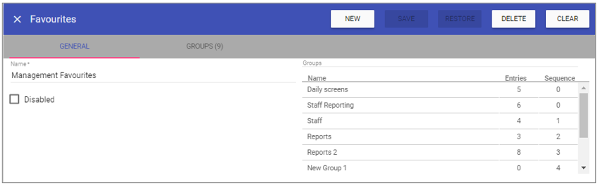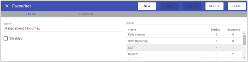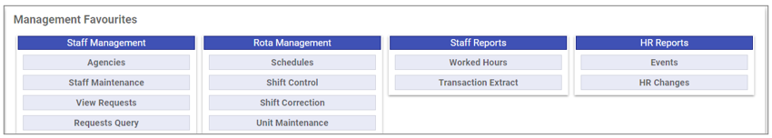 Favourites is used to define the library of favourites used for quick access to Staff.Care Menus from the initial page when first logged in. An example looks like the following: