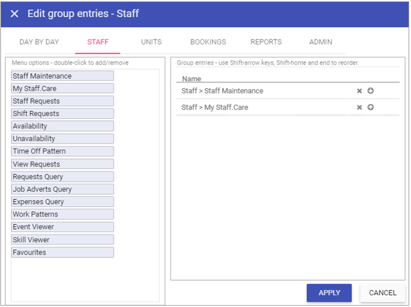 Once menus have been added to the group on the right hand side click APPLY.