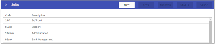 This screen allows you to create new Units, as well as maintaining existing Units that are stored on the system..